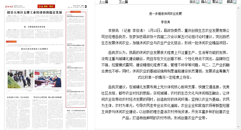 1月12日,縣政協(xié)委員、重慶創(chuàng)銳生態(tài)農(nóng)業(yè)發(fā)展有限公司總經(jīng)理岳良雙,在參加忠縣政協(xié)十四屆二次會議第五討論組討論時建議,突出自然生態(tài)發(fā)展休閑農(nóng)業(yè),加強休閑農(nóng)業(yè)與農(nóng)業(yè)產(chǎn)業(yè)化結(jié)合,形成一批休閑農(nóng)業(yè)精品項目。